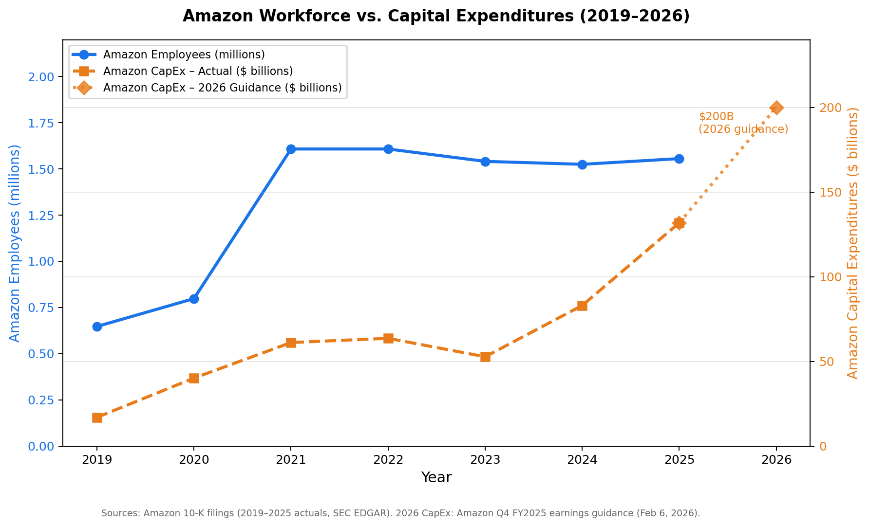 Amazon’s workforce expanded rapidly during the pandemic hiring surge before stabilizing. At the same time, capital investment — increasingly tied to AI infrastructure and cloud capacity — has continued to grow sharply.